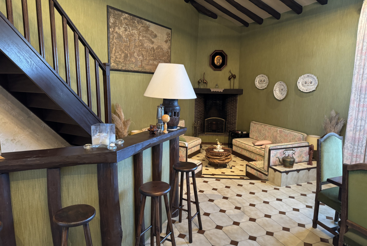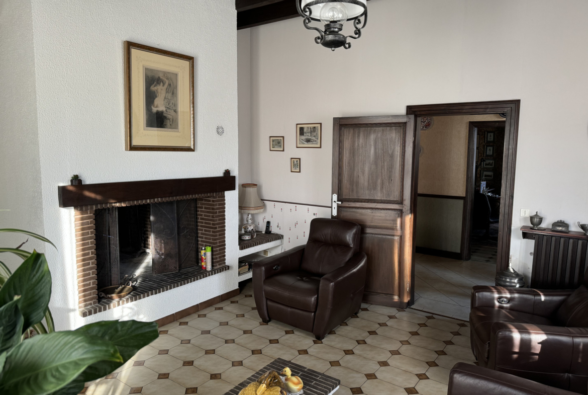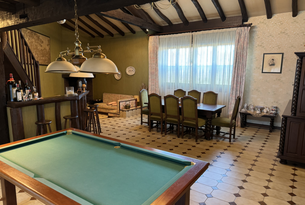 En rez-de-chaussée vous trouverez un spacieux hall d’entrée desservant une cuisine aménagée avec une cheminée à foyer ouvert donnant sur un salon, une salle à manger avec accès à une rochelle et une cave, un bureau, une chaufferie et un WC.